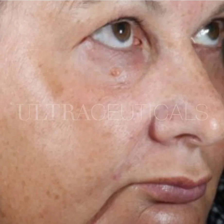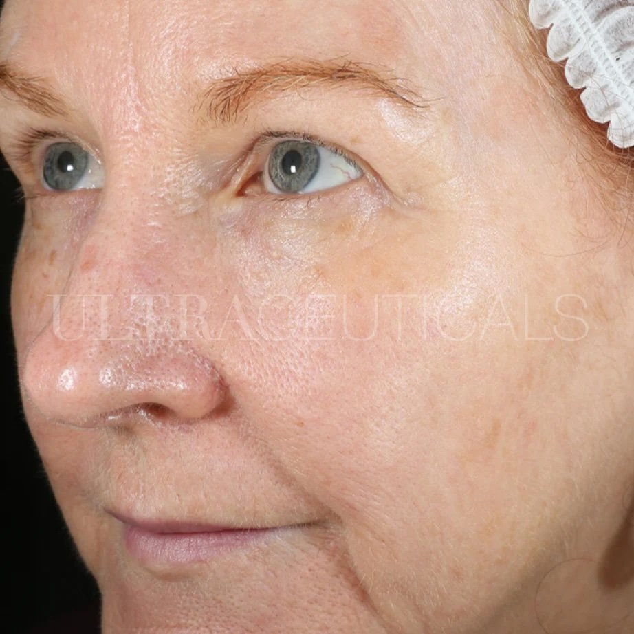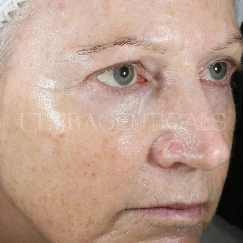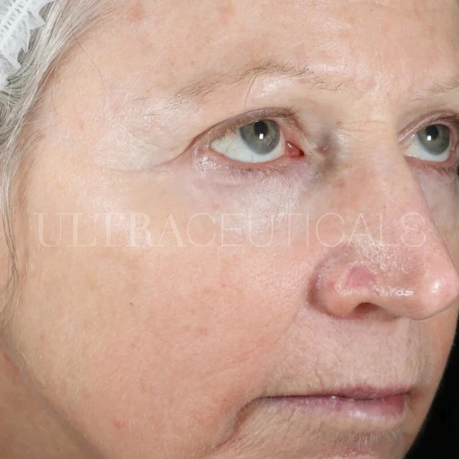 Results: Wrinkles and fine lines around the eyers appeared less visible. Cheeks appear plumper and firmer. Notable improvements in skins clarity and decrease in brown spots are evident.